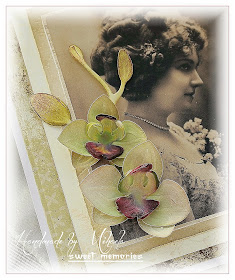 Here is another orchids over a vintage card. For this one I choosed to not use the stamp for the center of the flower because I created an pattern from various colors( purple, yellow, green, blue and pink).
